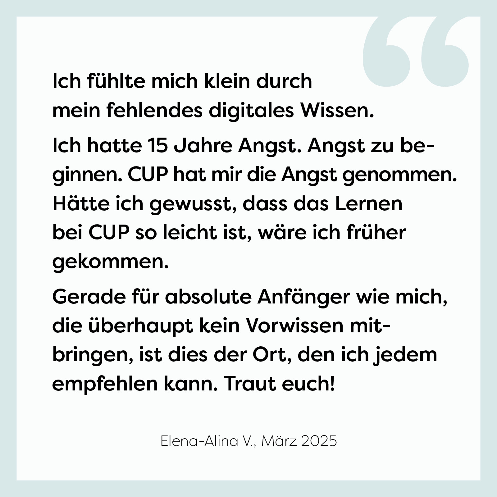 CUP begleitet Dich auf Deinem Weg in der digitalen Welt, egal ob Du Einsteiger*in oder Expert*in bist. Hier findest Du einen Überblick über unsere Angebote.
